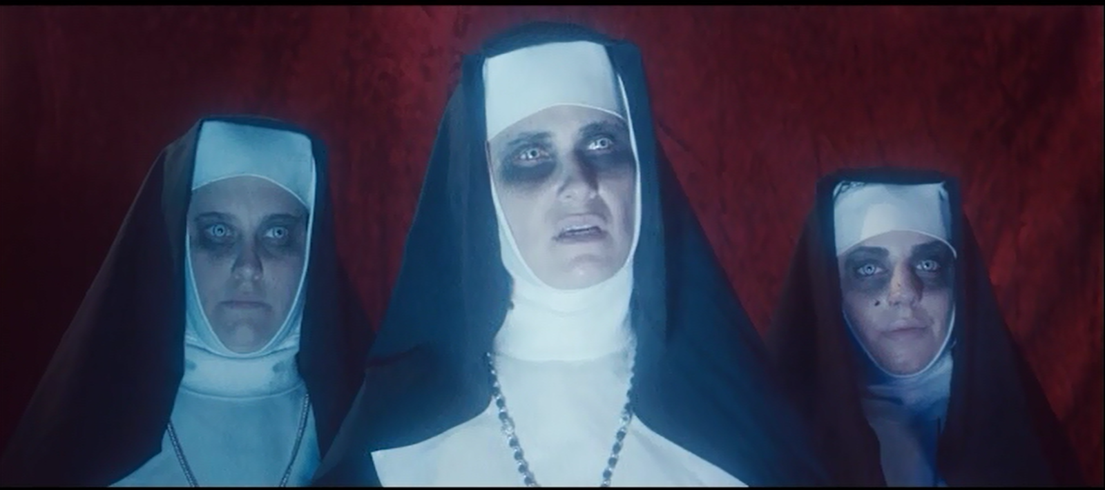 The group arrives and begin cleaning-up around the old school with varying degrees of commitment, some are there to do good in the neighborhood while others are clearly there to get laid. Of course the goody-goody Meredith begins judging the other teens right from the start, but she doesn't have too much time for judgement, for when two horny teens accidentally unleash the trio demonic nuns they all find themselves on the run for their lives.